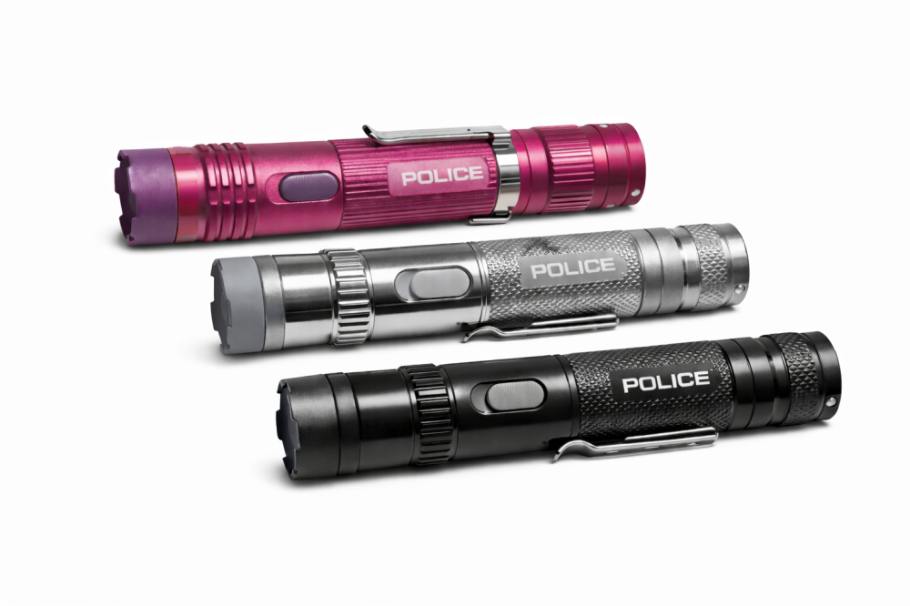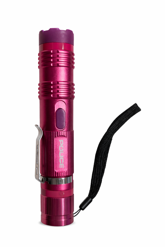 Apăsați butonul pentru a declanșa o descărcare electrică care poate lovi un atacator printr-un strat de îmbrăcăminte